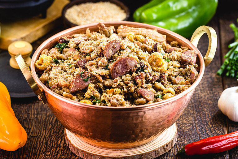 Feijao Tropeiro có nguyên liệu chủ yếu là đậu pinto, bột sắn, hành lá, trứng và thịt xông khói. Món này chế biến không hề và mất nhiều thời gian. Khi ăn, nêm muối tiêu, trộn với farofa được làm từ bột sắn, bơ, hành tây và ăn với cơm trắng.
