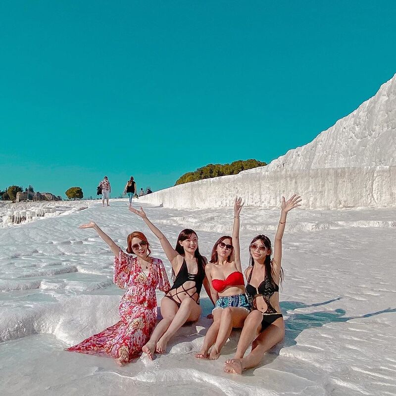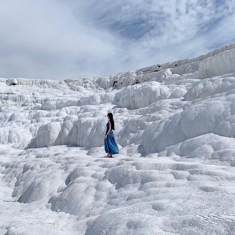 Đứng ở trên cao nhìn xuống, du khách khám phá tour du lịch Thổ Nhĩ Kỳ nhìn thấy núi tuyết trải dài ở sườn núi. Bạn sẽ thoải mái dạo chơi chụp ảnh sống ảo, thả bước chân đi bộ dưới làn nước cũng chính là cảm giác lý thú. Không chỉ vậy, cảnh sắc hoàng hôn lãng mạn ở Lâu đài bông khiến khung cảnh thiên nhiên trở nên bình yên và quyến rũ, tạo cho du khách sự mê mẩn và đắm say.