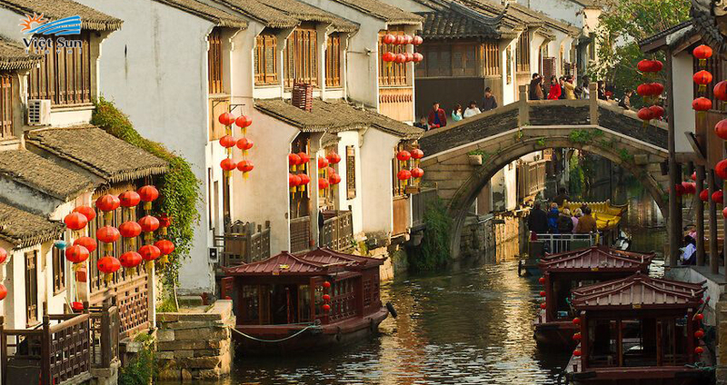 Khách tour Trung Quốc cũng có thể dành cả buổi chiều để khám phá thành phố cổ Tô Châu và băng qua những cây cầu đá yên bình. Ngoài ra, Tô Châu còn có Hàm Sơn Tự (ngôi chùa có không gian xanh và phong cách kiến trúc độc đáo), Bảo tàng Tơ lụa Tô Châu và Chuyên Chính Viên có ao sen siêu lớn.