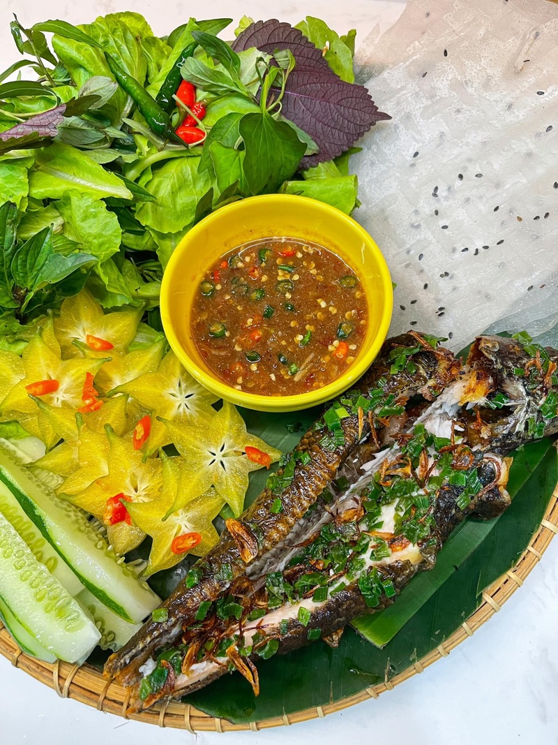 Khi đã nướng xong, người chế biến sẽ lấy đũa tách đôi sống lưng con cá ra, để lộ lớp thịt trắng muốt, mang mùi thơm phức khó cưỡng. Để món ăn thêm đậm đà, du khách sẽ ăn kèm thịt cá với rau sống, chuối, khế, bún,.. và nước chấm mắm chua ngọt, mắm me.