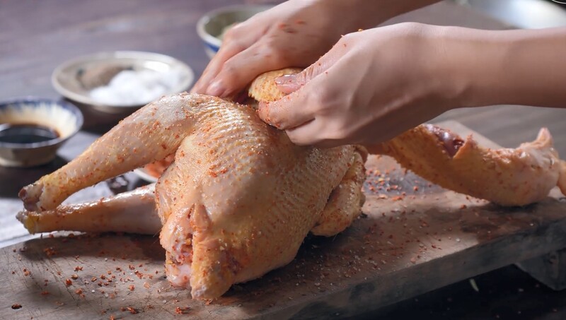 Canh thời gian khi đủ chín, người đầu bếp sẽ đem ra ra, xé thịt bóp cùng muối tiêu chanh và rau răm để thưởng thức. Miếng gà nướng vàng óng, thơm lừng với phần da giòn sần sật, miếng thịt mềm, đậm đà khiến bất kỳ ai thưởng thức đều mê đắm.