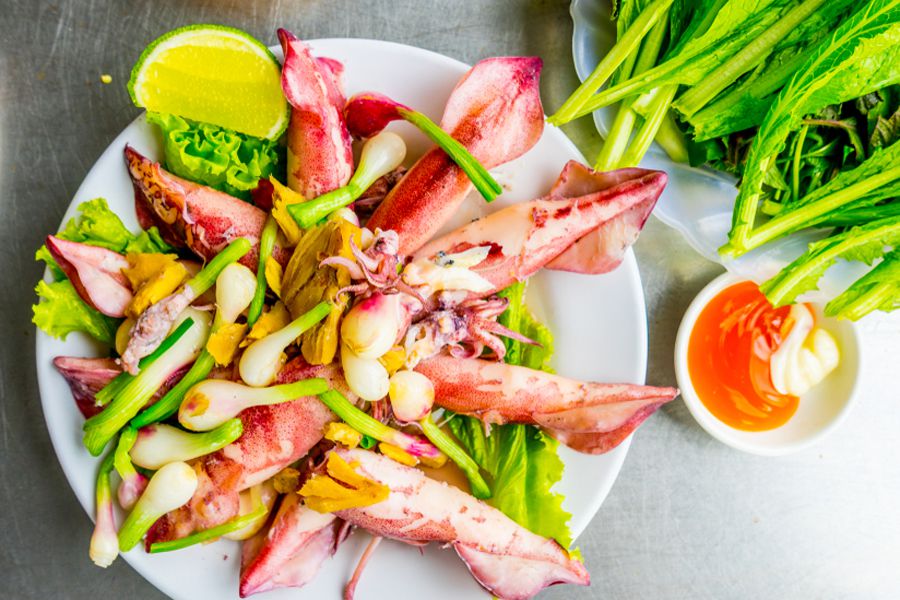 Khi đi các tour du lịch Nam Du, bạn chắc chắn sẽ bị hoa mắt với vô số món ăn hải sản phong phú, hấp dẫn, nhất là đĩa mực trứng hấp gừng.
