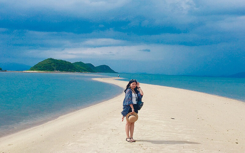 Nhiều người khi đi tour đảo Nha Trang đều thích thú tìm đến con đường cát trắng giữa biển của hòn đảo này để chụp ảnh. Khoảng cát có chiều dài 1km chạy ở giữa biển xanh. Bạn nên xem trước thời điểm thủy triều rút hàng tháng để lựa chọn lúc phù hợp nhất để tới check in nhé.
