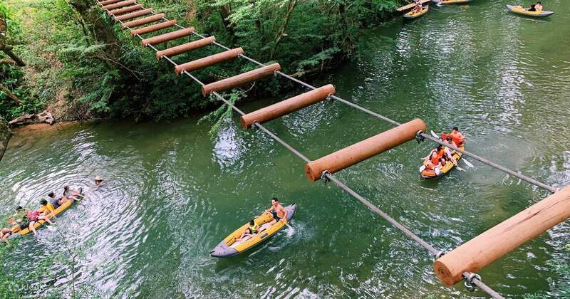 Không chỉ đắm chìm vào không gian xanh của thiên nhiên khách tour Quảng Bình 1 ngày có thể tham gia vào rất nhiều các hoạt động, trò chơi thực tế tại đây như Đu dây Tarzan, Chèo thuyền Kayak, Zipline, Đi bộ trên cáp đơn,… được tham gia vào hệ thống 17 trò chơi trên dây dài nhất Việt Nam. Và đặc biệt du khách đi tour du lịch Quảng Bình được khám phá hang động Ozo đẹp huyền bí với không gian bao quanh trước mặt đều là đá, nhũ đá và rèm nhũ, long lanh và óng ánh.