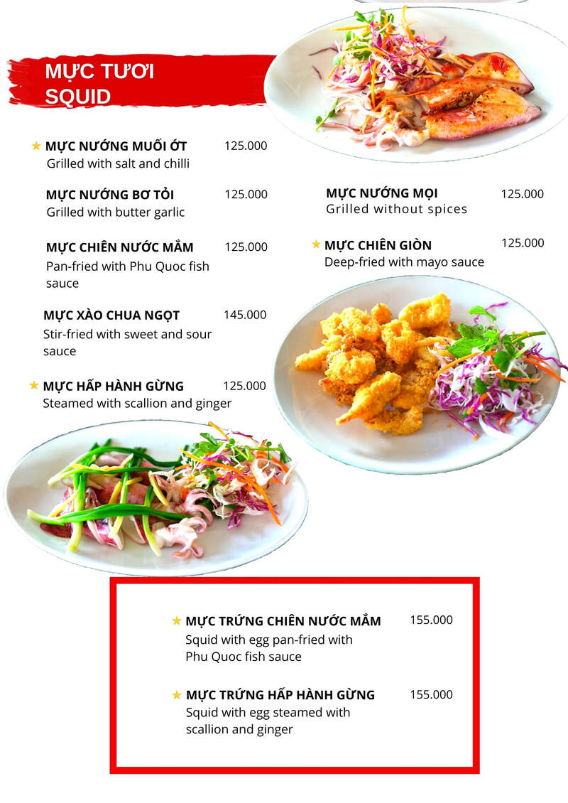 5. Các đồ ăn trong menu nhà hàng Xin Chào Phú Quốc
