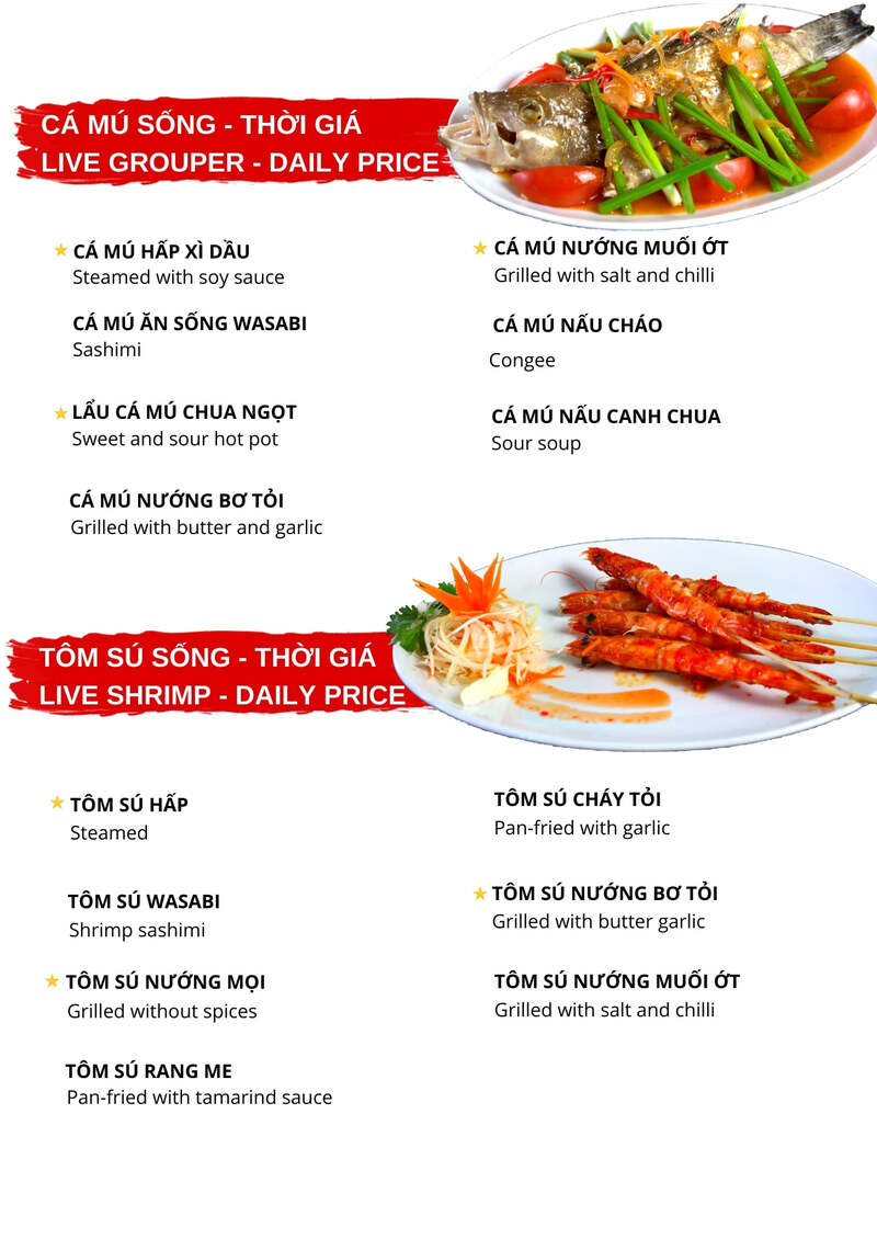 Các món ăn được chế biến và trang trí vô cùng đẹp mắt và hấp dẫn từ món chiên, xào, súp, canh, hấp, kho, rang… chiên đều có đủ. Và một điểm đặc biệt ở nhà hàng là khi đến đây bạn có thể tự tay lựa hải sản ở quán cho nhân viên nấu tại chỗ. Vì vậy khi đến đây bạn nhớ thưởng thức các món ăn trong menu đa dạng của quán nhé.
