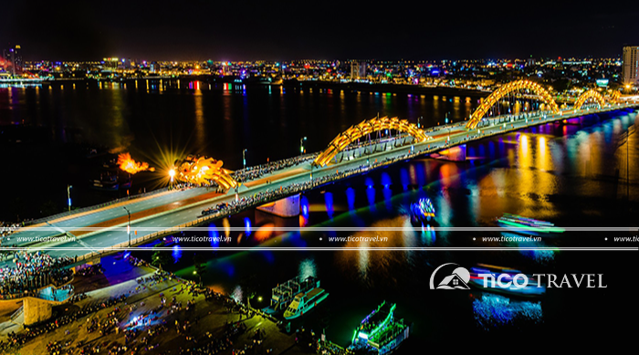 • Sau khi ăn tối, đoàn lên xe khởi hành về lại Đà Nẵng. Tự do vui chơi Đà Nẵng về đêm, thưởng ngoạn du thuyền trên sông Hàn, chụp ảnh Cầu Quay, cầu Rồng phun lửa và nước vào mỗi cuối tuần.