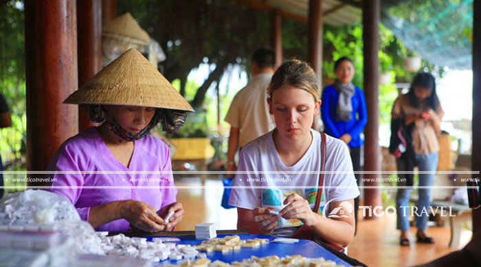 - Tiếp tục ngồi xuồng ba lá khám phá miệt vườn miền Tây. Sau đó đi tham quan lò kẹo dừa, một làng nghề truyền thống của xứ dừa Bến Tre. Thời gian này Quý khách còn được thưởng thức trái cây miền Tây (theo mùa) và nghe nhạc đờn ca tài tử Nam Bộ.