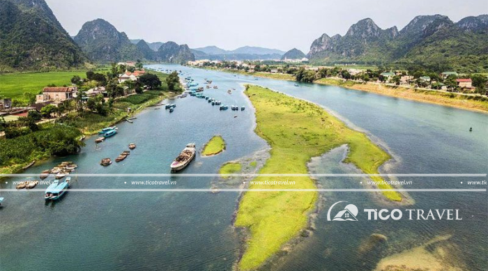• Quý khách lên thuyền theo dòng sông Son thơ mộng bắt đầu hành trình khám phá Động Phong Nha. Trong khoảng 30 phút đoàn tham quan có cơ hội ngắm nhìn phong cảnh làng quê yên bình hai bên bờ sông, những ngọn núi trùng điệp, quanh năm xanh tốt.