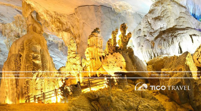 • Tiếp tục đi bộ thăm Hang Cô Tiên & Cung Đình mỗi hang lại mang một vẻ đẹp khác nhau. Hang Cô Tiên có những khối nhũ đá trải dài màu vàng như mái tóc mượt mà của nàng tiên. Hang Cung Đình lại có các nhũ đá được thiên nhiên trạm trổ giống như chiếc ngai vàng của ngọc hoàng.