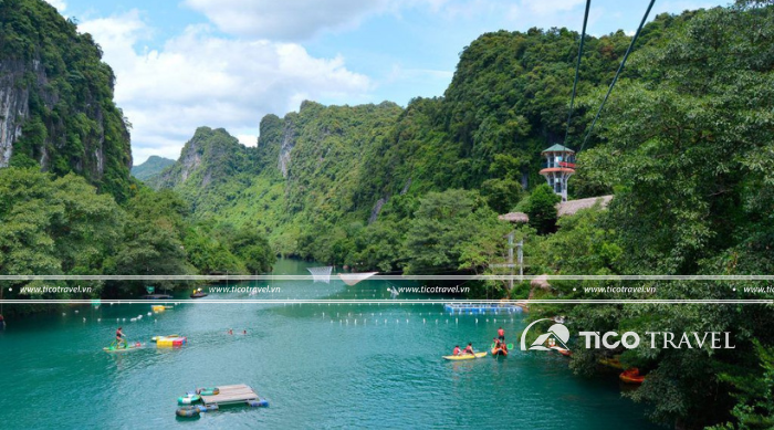 - Trải nghiệm tắm bùn thiên nhiên trong hang động rất tốt cho sức khỏe hay bơi qua hồ Thủy Tiên, Hồ Bồng Lai mát lạnh.