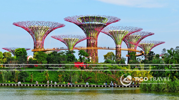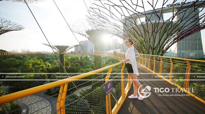 - Trải nghiệm OCBC Skyway – Đường đi bộ trên không, dài 128m nối giữa 2 siêu cây. Từ đây, Quý khách có thể ngắm nhìn toàn bộ khu vườn cũng như khung cảnh thành phố vịnh Marina Bay từ trên cao. (chi phí tự túc)