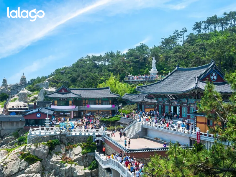 Sau đó xe và HDV đưa đoàn tham quan ngôi chùa cổ bên bờ biển Busan – là một trong những ngôi chùa cổ nhất Hàn Quốc, Haedong Yonggungsa còn được biết đến với kiến trúc độc đáo khi được xây dựng ngay gần bờ biển. Hầu hết các ngôi chùa ở Hàn Quốc đều được xây dựng trên núi, nhưng chùa này nằm ngay sát vách núi bên bờ biển, lưng tựa vào núi tạo nên một bầu không khí vô cùng thoáng đãng và yên bình. Nơi đây là sự kết hợp hài hòa giữa tín ngưỡng Phật giáo địa phương, yếu tố tâm linh và cảnh sắc đất trời, núi non, biển cả bao la.